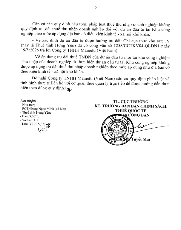- Về xác định dự án đầu tư được hưởng ưu đãi: Chi cục thuế khu vực IV (nay là Thuế tỉnh Hưng Yên) đã có công văn số 1258/CCTKV04-QLDN1 ngày 19/5/2025 trả lời Công ty TNHH Mainetti (Việt Nam).