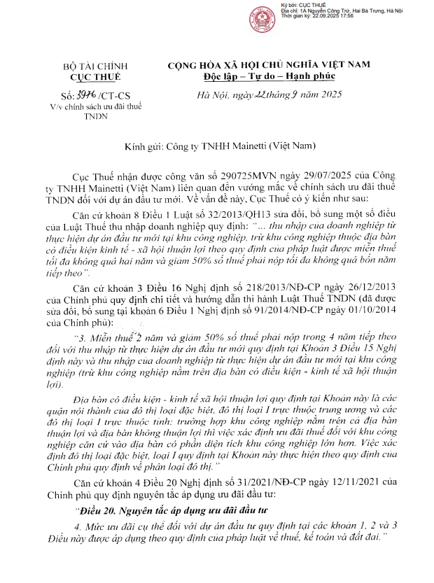 Ngày 22/09/2025, Cục Thuế ban hành Công văn 3976/CT-CS 2025 trả lời vướng mắc của Công ty TNHH Mainetti (Việt Nam) về việc áp dụng ưu đãi thuế TNDN đối với dự án đầu tư mới tại khu công nghiệp, cụ thể liên quan đến tiêu chí địa bàn kinh tế – xã hội khó khăn và tiêu chuẩn phân loại đô thị.