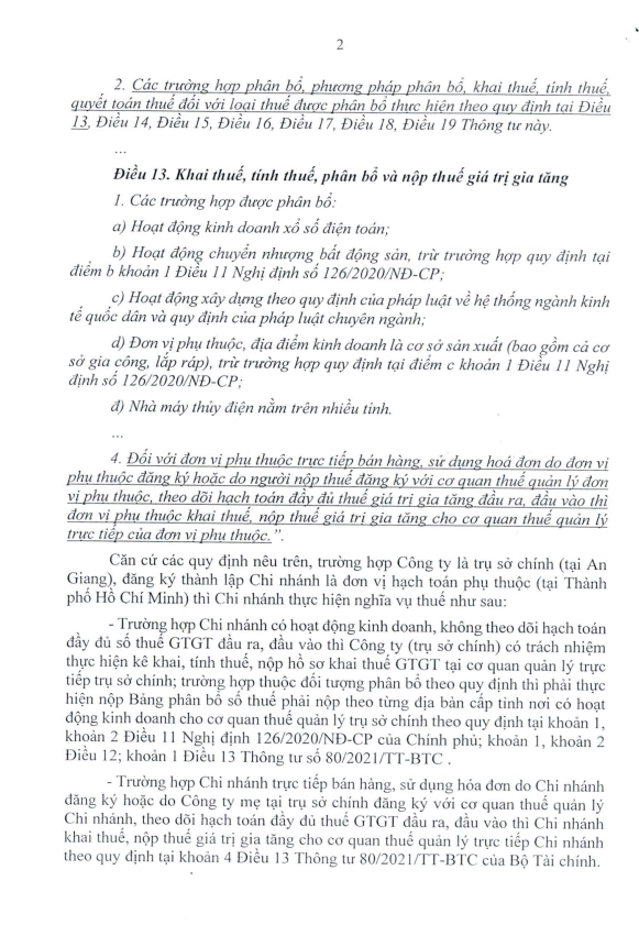 - Thông tư 80/2021/TT-BTC – Điều 12 và Điều 13: Hướng dẫn phân bổ nghĩa vụ thuế và khai, nộp thuế GTGT đối với đơn vị phụ thuộc.