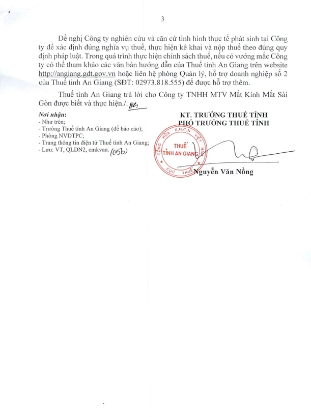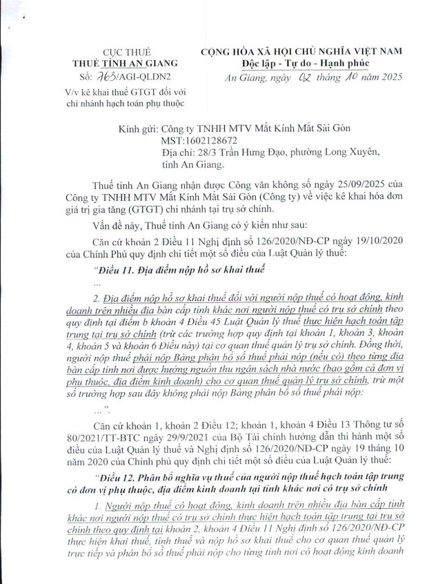 Ngày 02/10/2025, Cục thuế tỉnh An Giang ban hành Công văn 763/AGI-QLDN2 nhằm phản hồi đề nghị của Công ty TNHH MTV Mắt Kính Mắt Sài Gòn liên quan đến việc kê khai hóa đơn GTGT cho chi nhánh hạch toán phụ thuộc tại Thành phố Hồ Chí Minh.