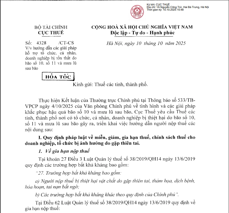 Công văn 4328/CT-CS thể hiện rõ quan điểm hỗ trợ kịp thời của cơ quan thuế đối với người nộp thuế bị ảnh hưởng do thiên tai. Doanh nghiệp, hộ kinh doanh cần chủ động rà soát thiệt hại, hoàn thiện hồ sơ và làm việc với cơ quan thuế để được hưởng các ưu đãi theo quy định.
