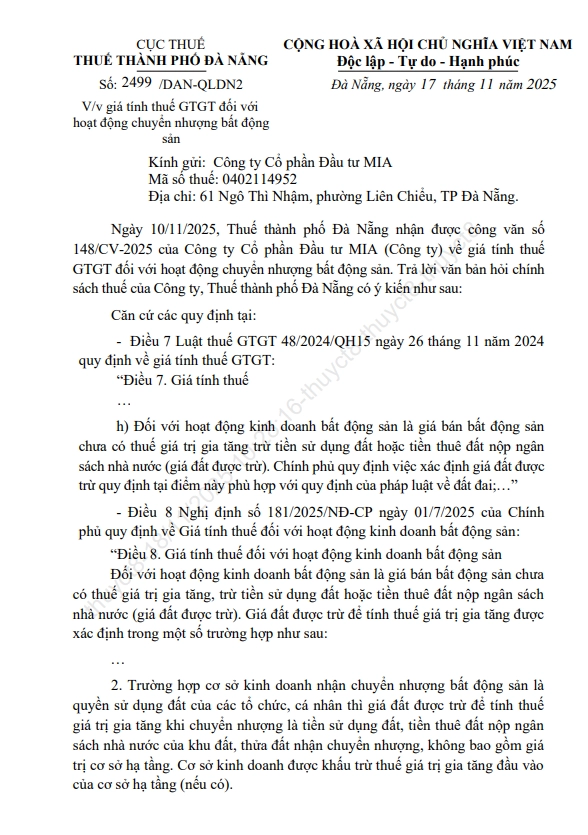 Ngày 17/11/2025, Cục Thuế TP. Đà Nẵng ban hành Công văn số 2499/DAN-QLDN2 nhằm giải đáp vướng mắc của Công ty Cổ phần Đầu tư MIA liên quan đến giá tính thuế giá trị gia tăng (GTGT) trong hoạt động chuyển nhượng bất động sản. Doanh nghiệp trong lĩnh vực bất động sản cần đặc biệt lưu ý những nội dung sau để đảm bảo kê khai, tính thuế đúng quy định.