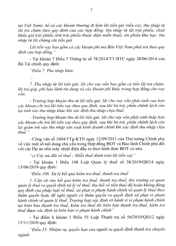- Công văn số 1604/TTg-KTN ngày 12/09/2011 nêu rõ dự án BOT nhà máy nhiệt điện đầu tư theo hình thức BOT được miễn thuế đánh trên lãi tiền vay, theo quy định bảo lãnh Chính phủ.