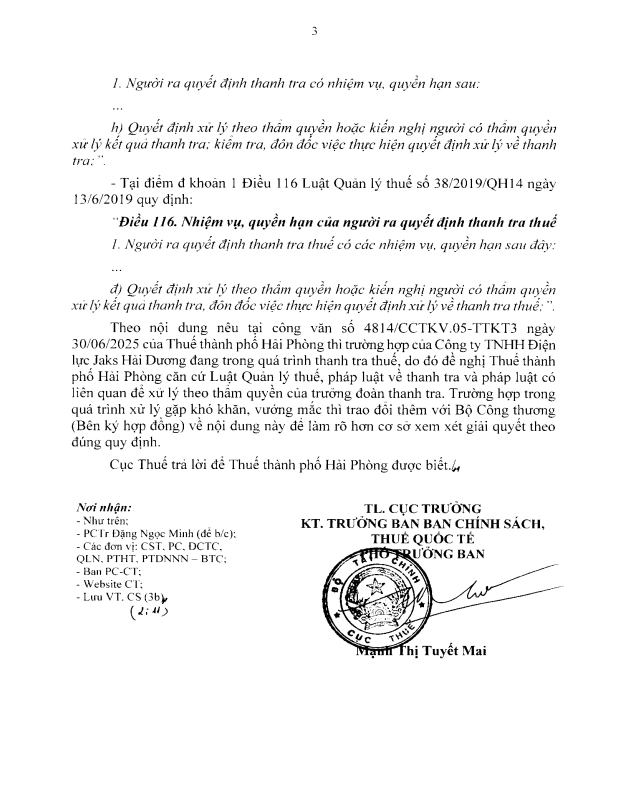 - Công ty TNHH Điện lực Jaks Hải Dương đang trong quá trình thanh tra thuế. Thuế thành phố Hải Phòng căn cứ các quy định pháp luật về quản lý thuế, thanh tra và liên quan để xử lý theo thẩm quyền của trưởng đoàn thanh tra.