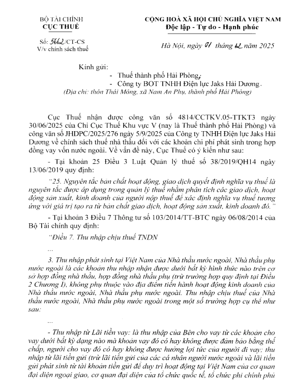 Trong quá trình thực hiện các dự án BOT có yếu tố vay vốn nước ngoài, nhiều doanh nghiệp thắc mắc về nghĩa vụ thuế nhà thầu đối với các khoản chi phí tài chính phát sinh, đặc biệt là lãi vay và các loại phí liên quan. Mới đây, Cục Thuế ban hành Công văn số 5662/CT-CS ngày 01/12/2025 hướng dẫn cụ thể trường hợp của Công ty TNHH Điện lực Jaks Hải Dương – một dự án BOT nhiệt điện có bảo lãnh Chính phủ.