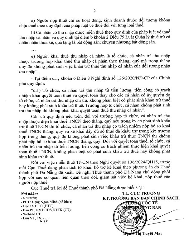 Cục Thuế cho biết hiện đang phân tích tờ khai và xây dựng phương án hỗ trợ kê khai đối với thu nhập được miễn thuế theo Nghị quyết 136/2024/QH15, trên cơ sở đề xuất của Thuế thành phố Đà Nẵng. Đồng thời, Thuế thành phố Đà Nẵng được yêu cầu chủ động phối hợp với các cơ quan liên quan để theo dõi, giám sát việc kê khai và nộp thuế của người nộp thuế theo đúng quy định.