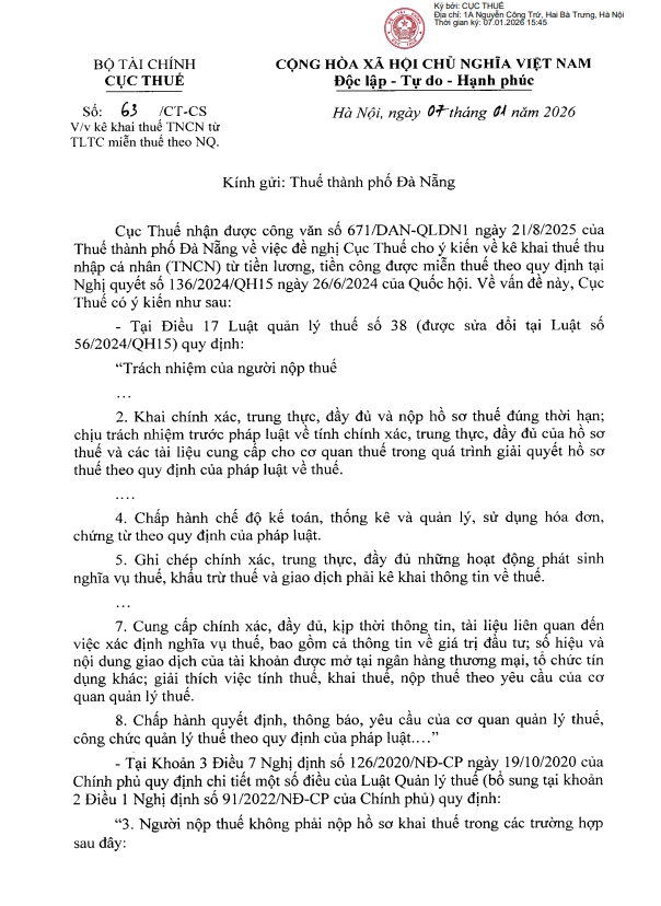 Ngày 07/01/2026, Cục Thuế đã ban hành Công văn số 63/CT-CS hướng dẫn việc kê khai thuế thu nhập cá nhân (TNCN) đối với tiền lương, tiền công được miễn thuế theo Nghị quyết số 136/2024/QH15 của Quốc hội. Công văn có hiệu lực kể từ ngày ban hành và được áp dụng trong quá trình tổ chức thực hiện kê khai, quyết toán thuế TNCN.