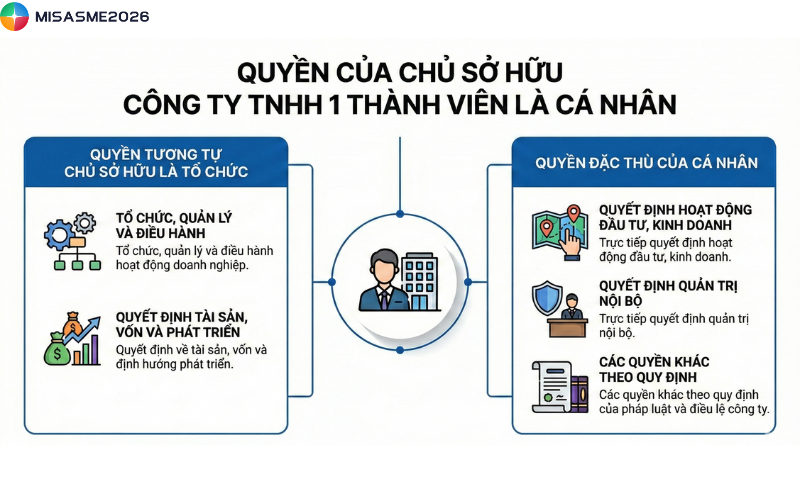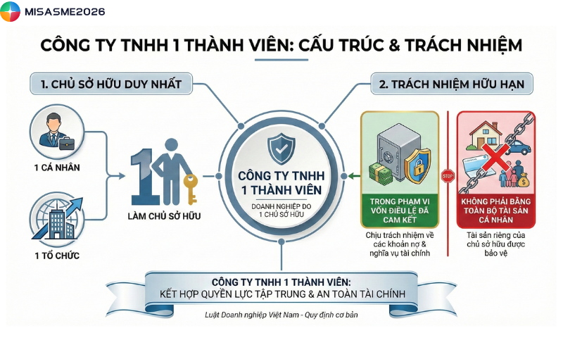 Cơ cấu tổ chức công ty trách nhiệm hữu hạn một thành viên là nền tảng quan trọng giúp doanh nghiệp vận hành hiệu quả và tuân thủ đúng quy định pháp luật. Tùy theo chủ sở hữu là cá nhân hay tổ chức, mô hình quản lý và điều hành sẽ được bố trí khác nhau. Bài viết sau đây của MISA SME cung cấp cái nhìn tổng quan về cơ cấu tổ chức, các chức danh quản lý và quyền, nghĩa vụ của chủ sở hữu trong công ty TNHH một thành viên theo quy định hiện hành.