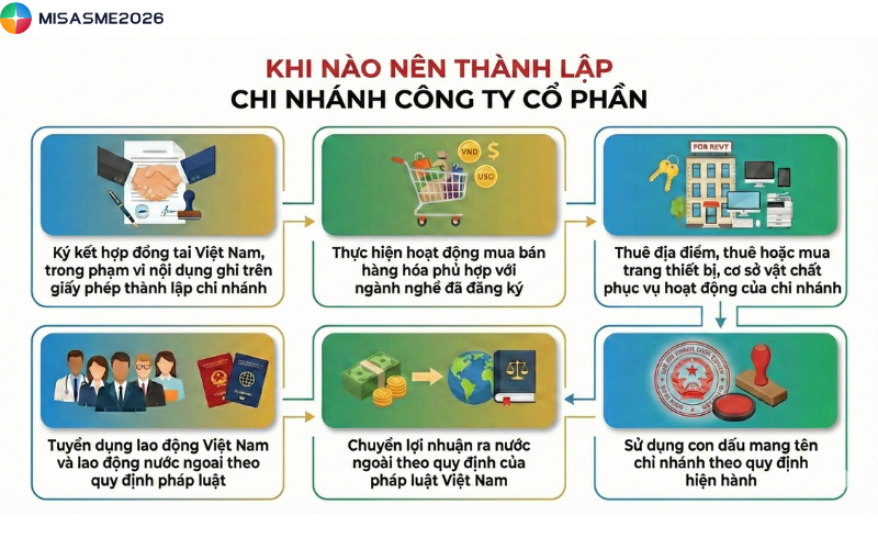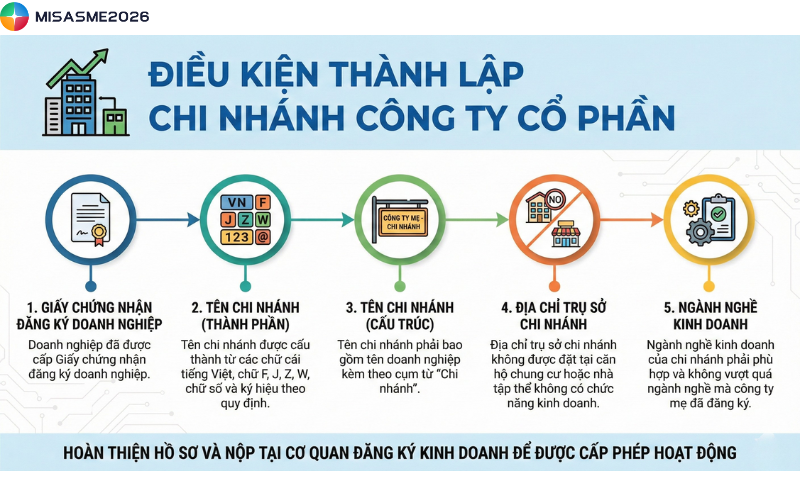 Thành lập chi nhánh công ty cổ phần là giải pháp giúp doanh nghiệp mở rộng phạm vi hoạt động và phát triển quy mô kinh doanh một cách hợp pháp. Để chi nhánh được cấp phép và vận hành thuận lợi, doanh nghiệp cần nắm rõ các quy định về điều kiện, hồ sơ và trình tự thực hiện theo pháp luật hiện hành. Bài viết dưới đây của MISA SME sẽ đề cập chi tiết hơn về vấn đề này.