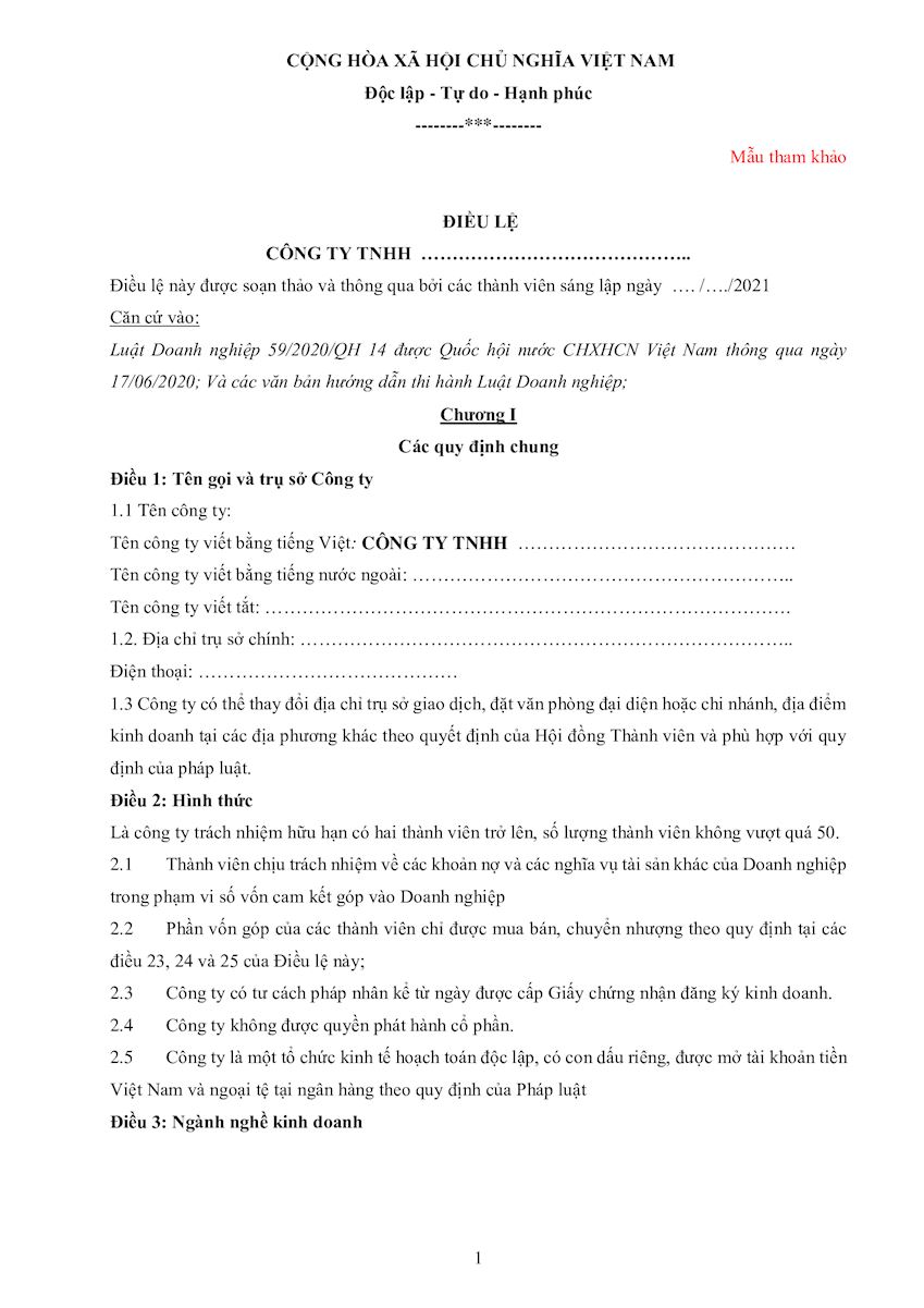 Mẫu điều lệ công ty TNHH 2 thành viên dưới đây được xây dựng theo đúng quy định của Luật Doanh nghiệp 2020, đầy đủ các nội dung cần thiết để doanh nghiệp sử dụng khi thành lập hoặc cập nhật điều lệ.