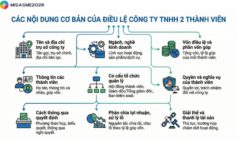 Điều lệ công ty TNHH 2 thành viên là văn bản quan trọng quy định cách tổ chức, quản lý và hoạt động của doanh nghiệp. Đây không chỉ là hồ sơ bắt buộc khi thành lập công ty mà còn là cơ sở để các thành viên thống nhất quyền, nghĩa vụ và xử lý các vấn đề phát sinh trong quá trình hoạt động. Mẫu điều lệ gồm những thông tin gì, nếu sửa đổi cần có làm ra sao, MISA SME sẽ giải thích chi tiết ngay dưới đây.