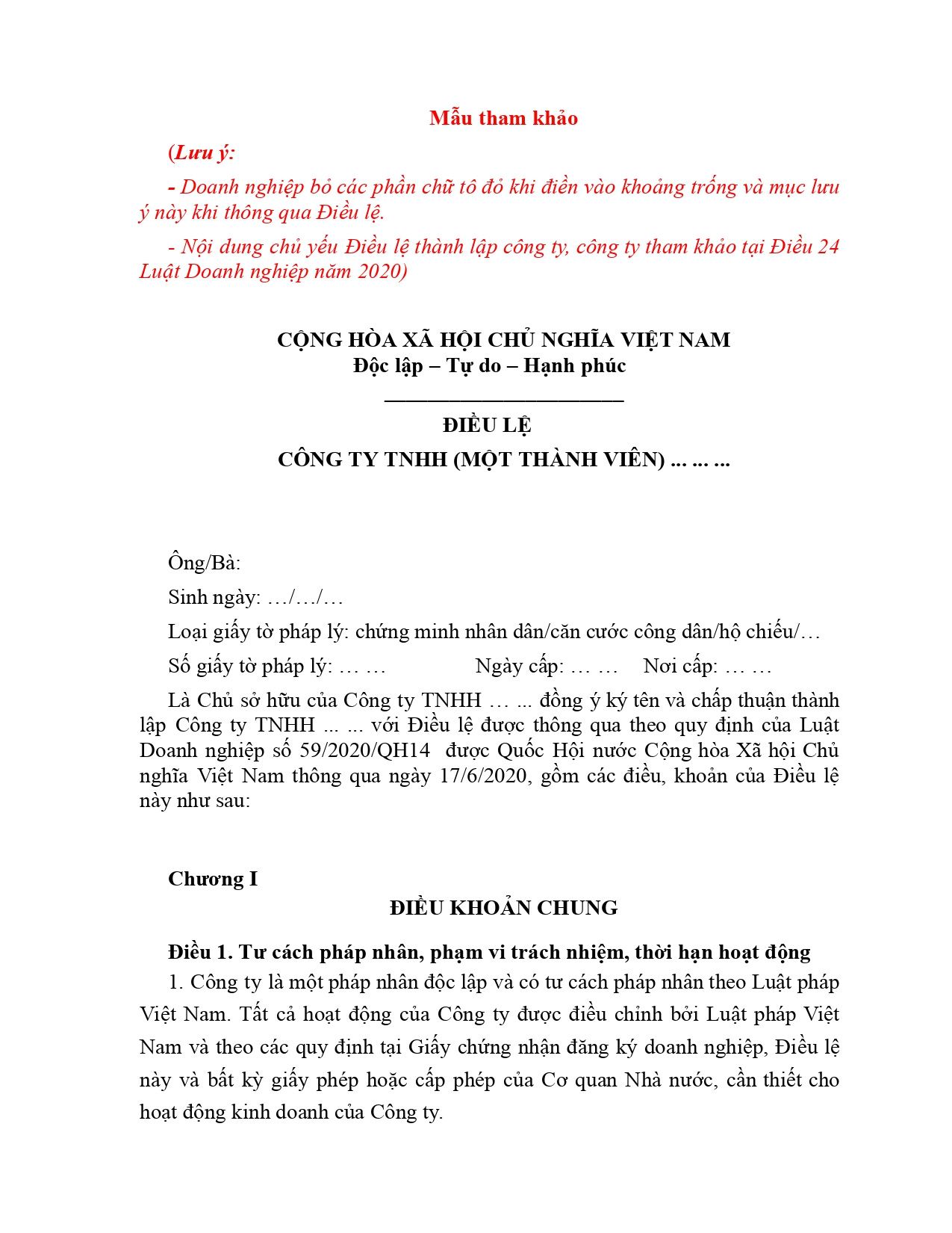 [ Tải mẫu điều lệ công ty TNHH 1 thành viên do cá nhân làm cá nhân]