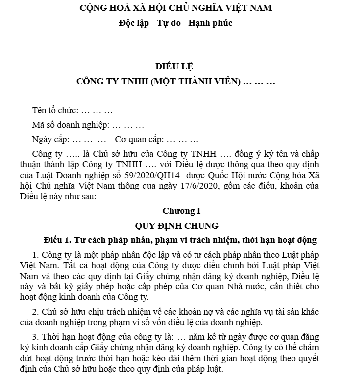 2. Tải mẫu điều lệ công ty TNHH 1 thành viên
