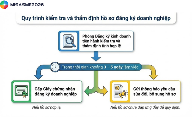 Sau khi tiếp nhận hồ sơ, Phòng Đăng ký kinh doanh sẽ tiến hành kiểm tra và thẩm định tính hợp lệ. Trong thời gian khoảng 3 – 5 ngày làm việc, cơ quan đăng ký sẽ:
