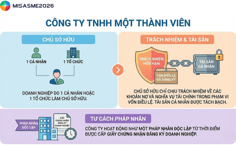 Công ty TNHH một thành viên là doanh nghiệp do một cá nhân hoặc một tổ chức làm chủ sở hữu. Người sở hữu chỉ chịu trách nhiệm về các khoản nợ và nghĩa vụ tài chính trong phạm vi vốn điều lệ đã đăng ký, vì vậy tài sản cá nhân được tách bạch. Từ thời điểm được cấp Giấy chứng nhận đăng ký doanh nghiệp, công ty hoạt động như một pháp nhân độc lập.