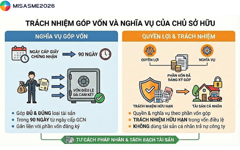 Chủ sở hữu có nghĩa vụ góp đủ và đúng loại tài sản đã cam kết trong vòng 90 ngày kể từ ngày được cấp Giấy chứng nhận đăng ký doanh nghiệp. Quyền và nghĩa vụ của chủ sở hữu gắn liền với phần vốn đã đăng ký góp.