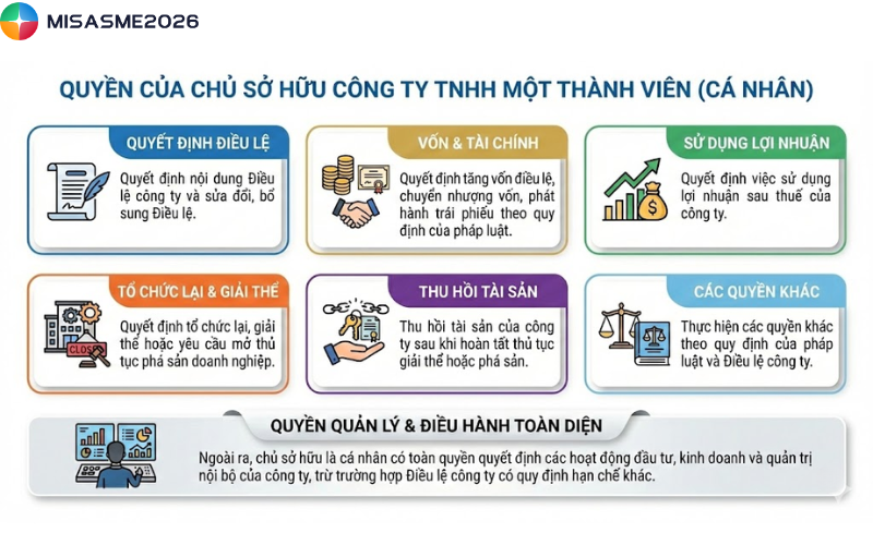 Theo quy định của Luật Doanh nghiệp 2020, chủ sở hữu công ty TNHH một thành viên có các quyền rộng rãi trong việc quyết định và kiểm soát toàn bộ hoạt động của doanh nghiệp. Tùy thuộc vào việc chủ sở hữu là tổ chức hay cá nhân, phạm vi và cách thức thực hiện quyền có sự khác nhau nhất định.