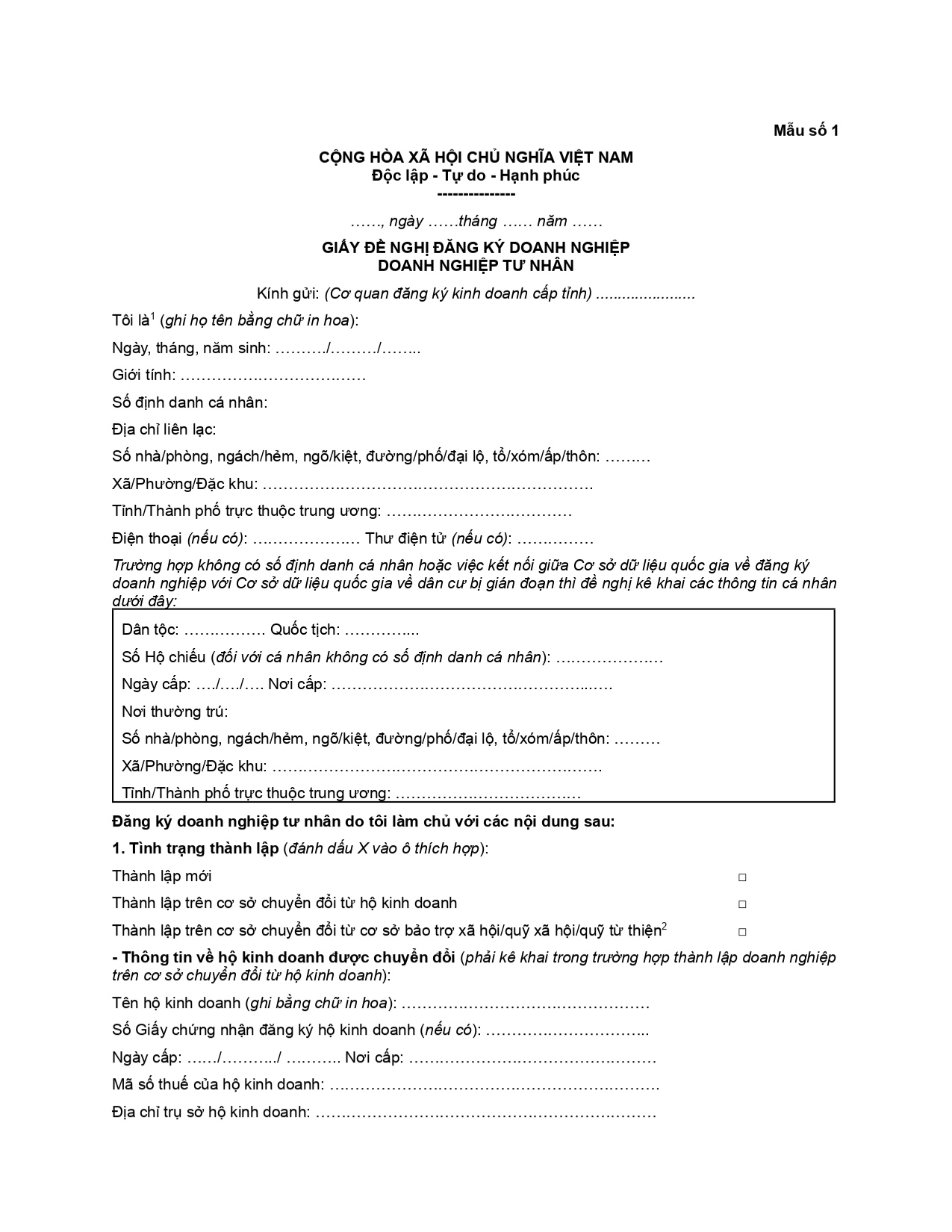 1. Giấy đề nghị đăng ký doanh nghiệp tư nhân