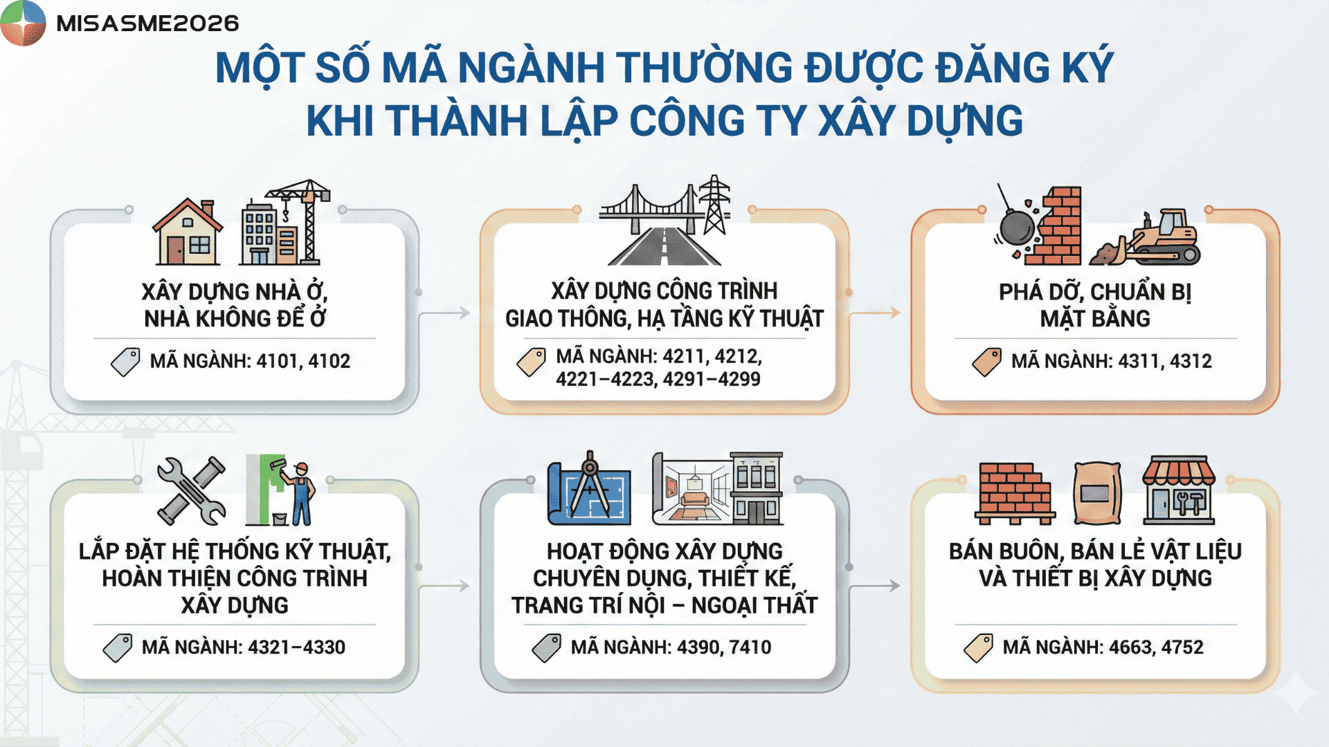 Một số mã ngành thường được đăng ký khi thành lập công ty xây dựng gồm: