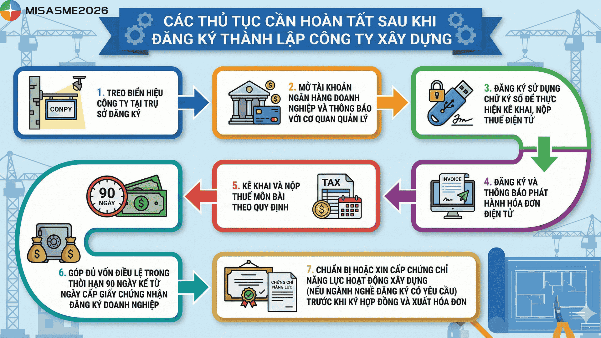 • Chuẩn bị hoặc xin cấp chứng chỉ năng lực hoạt động xây dựng (nếu ngành nghề đăng ký có yêu cầu) trước khi ký hợp đồng và xuất hóa đơn.