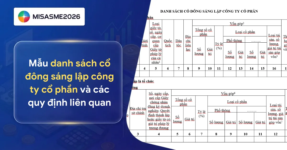 Danh sách cổ đông sáng lập công ty cổ phần là tài liệu bắt buộc trong bộ hồ sơ đăng ký thành lập công ty cổ phần. Danh sách này phải có thông tin chi tiết về cá nhân, tổ chức góp vốn đầu tiên, đảm bảo tối thiểu 3 người. Trong bài viết này, phần mềm kế toán MISA SME sẽ cung cấp mẫu chuẩn mới nhất và hướng dẫn cách hoàn thiện hồ sơ chi tiết.