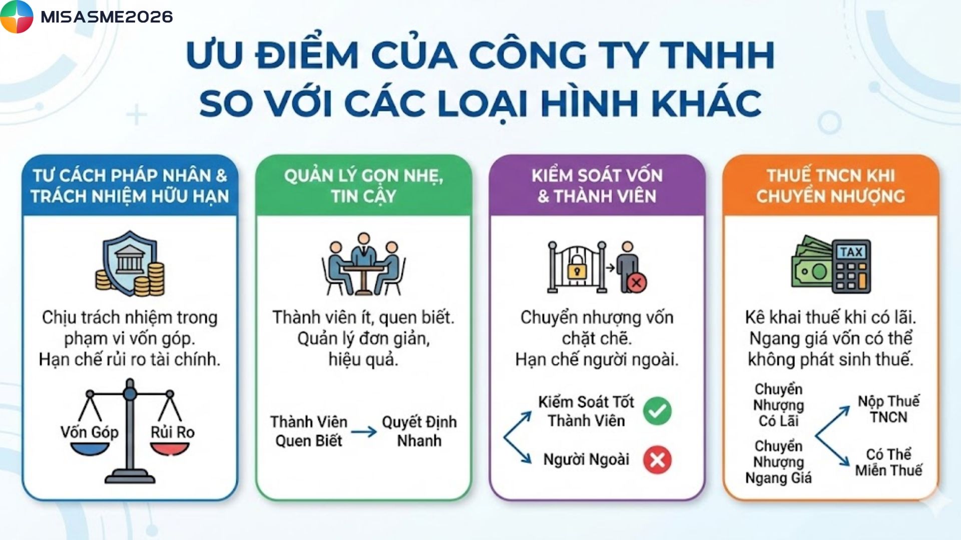 Có tư cách pháp nhân, chủ sở hữu/thành viên chỉ chịu trách nhiệm hữu hạn trong phạm vi vốn góp, giúp hạn chế rủi ro tài chính.