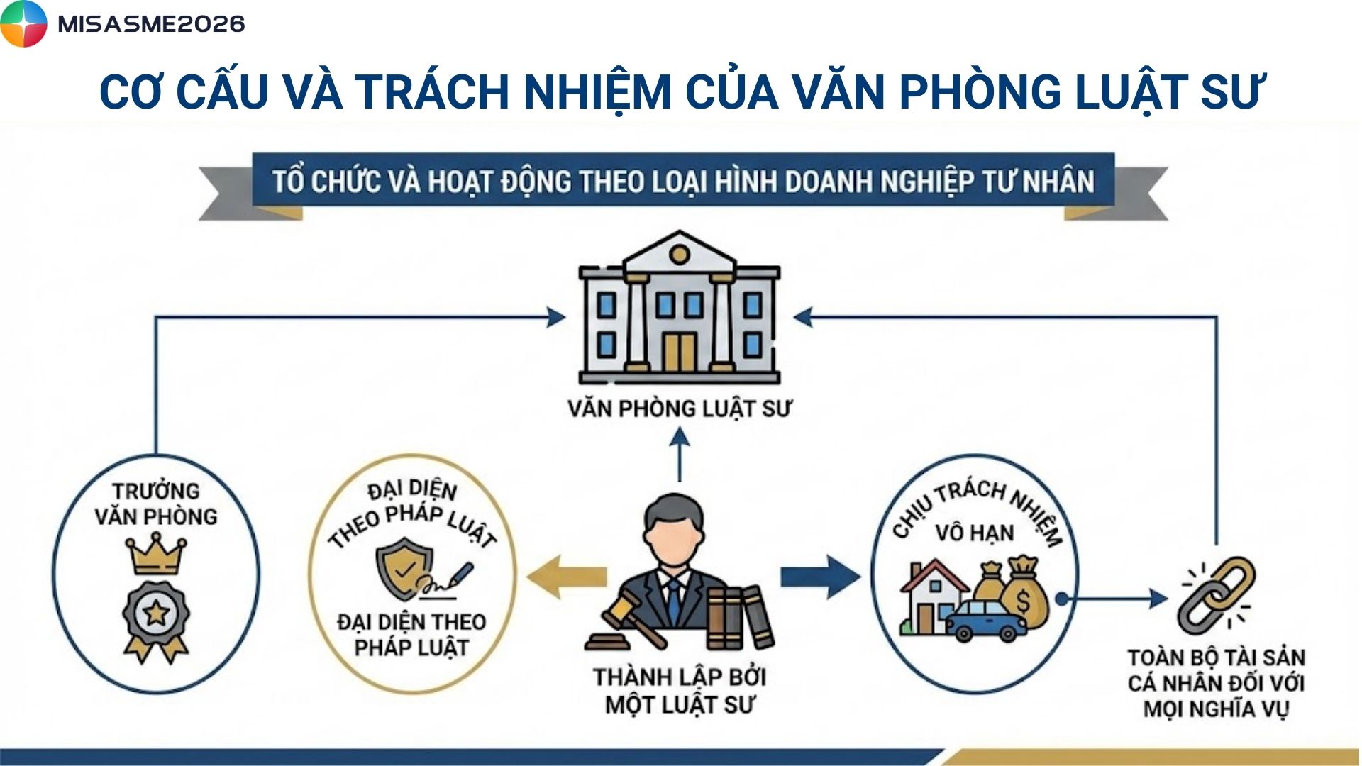 Văn phòng luật sư do một luật sư thành lập và được tổ chức, hoạt động theo loại hình doanh nghiệp tư nhân. Người thành lập đồng thời là Trưởng văn phòng, giữ vai trò đại diện theo pháp luật và phải chịu trách nhiệm bằng toàn bộ tài sản của mình đối với mọi nghĩa vụ của văn phòng.