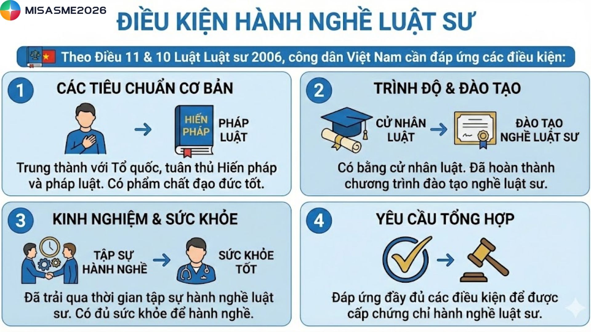 Theo quy định tại Điều 11 Luật Luật sư năm 2006, công dân Việt Nam muốn hành nghề luật sư cần đáp ứng đầy đủ các điều kiện theo quy định của pháp luật. Cụ thể, cá nhân phải đảm bảo các tiêu chuẩn luật sư được nêu tại Điều 10 Luật Luật sư, bao gồm: