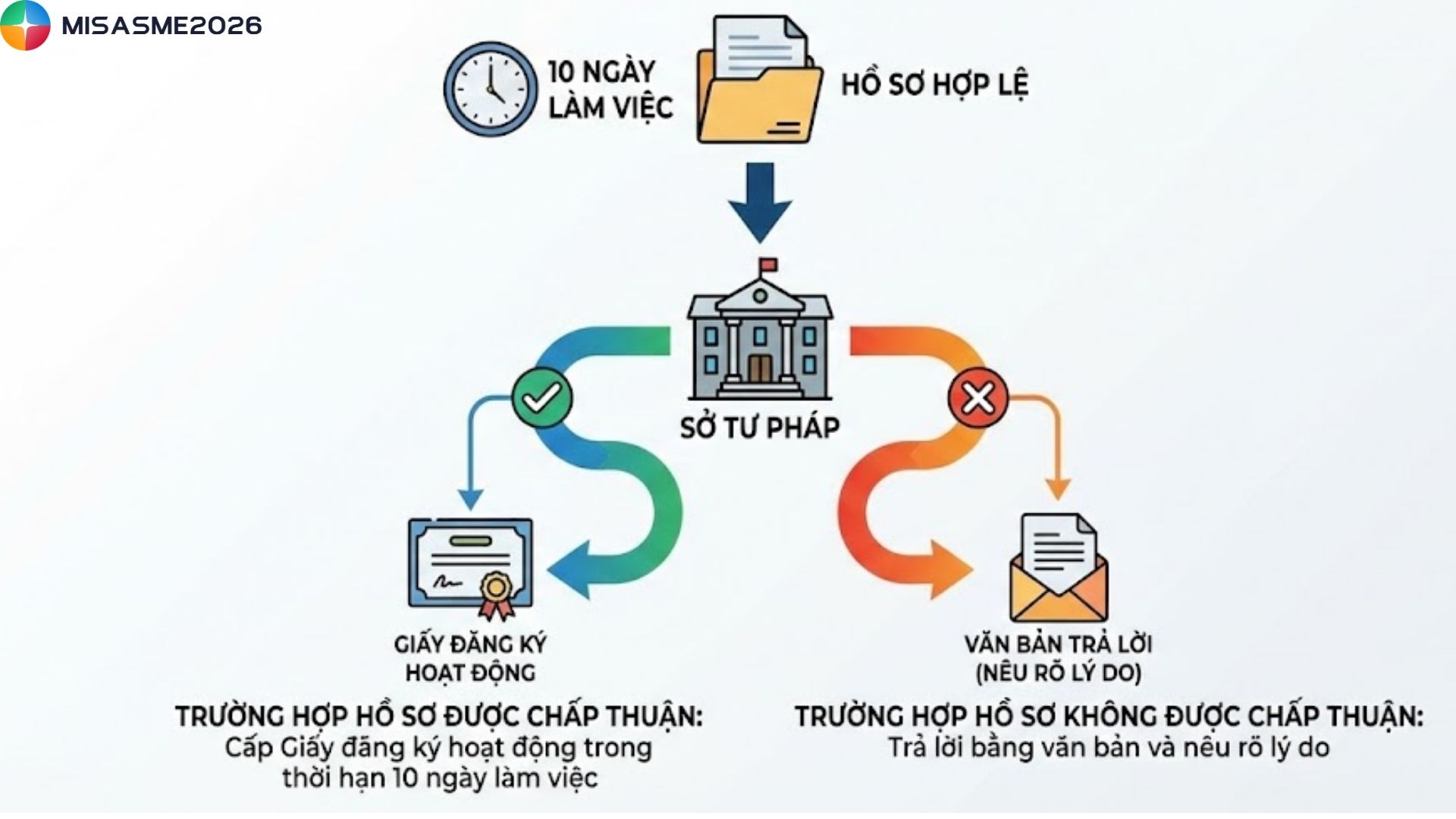 Trong thời hạn 10 ngày làm việc kể từ khi nhận đủ hồ sơ hợp lệ, Sở Tư pháp sẽ xem xét và cấp Giấy đăng ký hoạt động cho văn phòng luật sư