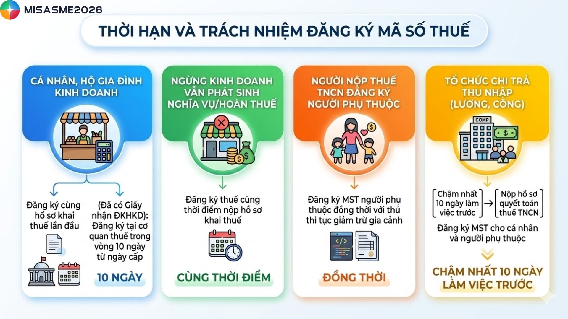 - Cá nhân, nhóm cá nhân, hộ gia đình kinh doanh: Thực hiện đăng ký thuế đồng thời với thời điểm nộp hồ sơ khai thuế lần đầu. Trường hợp đã được cấp Giấy chứng nhận đăng ký hộ kinh doanh, phải đăng ký MST tại cơ quan thuế trong vòng 10 ngày kể từ ngày được cấp giấy chứng nhận.
