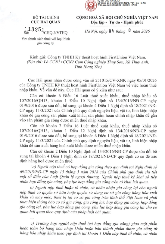 Công văn 13251/CHQ-NVTHQ ngày 04/03/2026 của Cục Hải quan đã làm rõ quy định về thuế nhập khẩu đối với hàng hóa gia công lại, đặc biệt trong trường hợp doanh nghiệp thuê đơn vị khác thực hiện một phần hoặc toàn bộ công đoạn sản xuất.