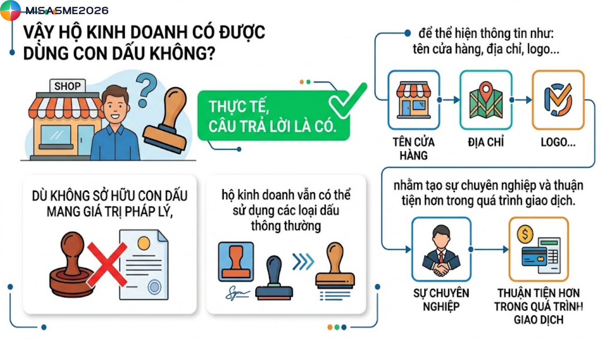 Con dấu hộ kinh doanh là một trong những vấn đề khiến nhiều chủ hộ băn khoăn khi bắt đầu hoạt động kinh doanh: có bắt buộc không, dùng như thế nào cho đúng và có rủi ro pháp lý gì cần lưu ý? Nếu bạn cũng đang tìm hiểu về con dấu hộ kinh doanh để sử dụng đúng quy định và chuyên nghiệp hơn trong giao dịch, bài viết dưới đây của phần mềm kế toán MISA SME sẽ giúp bạn nắm rõ từ A–Z.