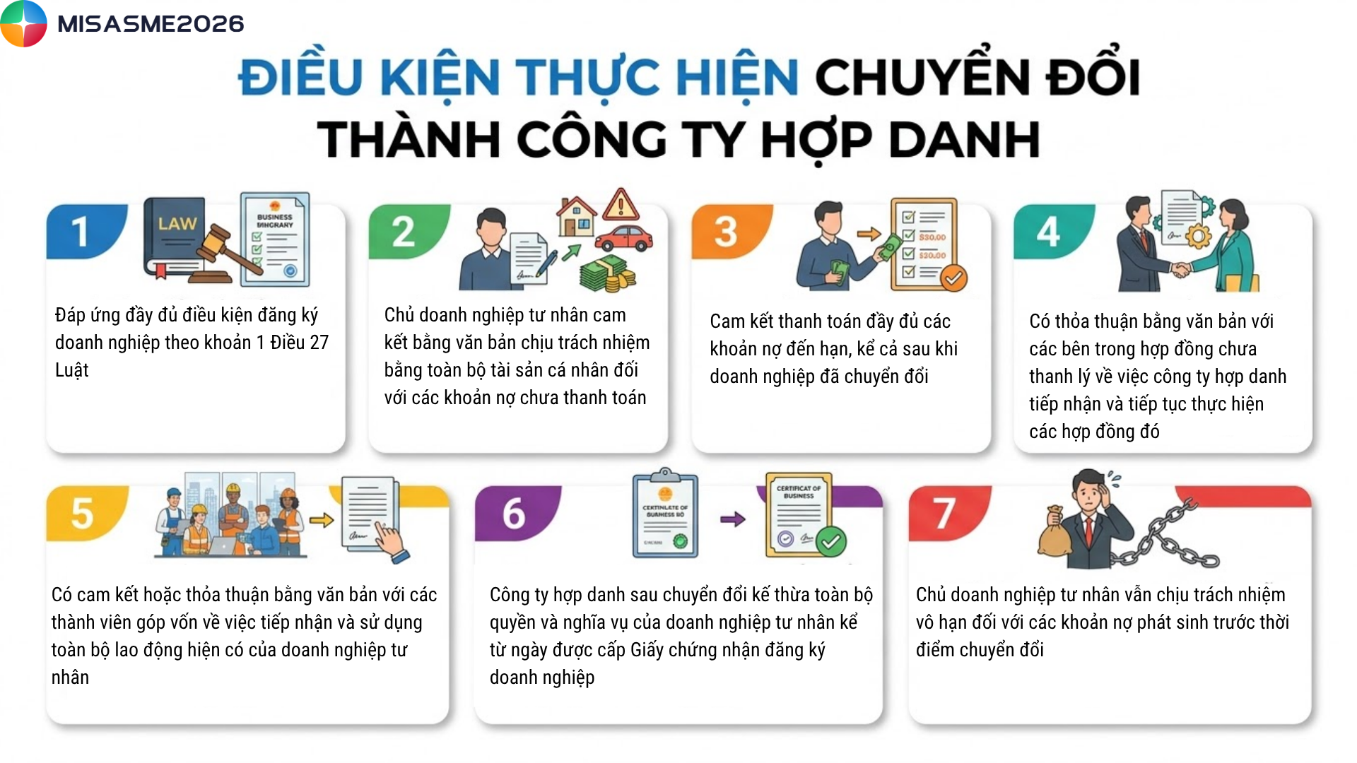 Việc chuyển đổi doanh nghiệp tư nhân thành công ty hợp danh đang trở thành lựa chọn của nhiều chủ doanh nghiệp khi muốn mở rộng quy mô và nâng cao uy tín kinh doanh. Tuy nhiên, quá trình chuyển đổi này đòi hỏi phải đáp ứng đầy đủ điều kiện pháp lý, chuẩn bị hồ sơ chính xác và thực hiện đúng quy trình theo quy định. Bài viết dưới đây của phần mềm kế toán MISA SME sẽ giúp bạn đọc nắm rõ toàn bộ điều kiện, hồ sơ và thủ tục cần thiết khi thực hiện chuyển đổi, giúp bạn tiết kiệm thời gian và hạn chế rủi ro pháp lý.