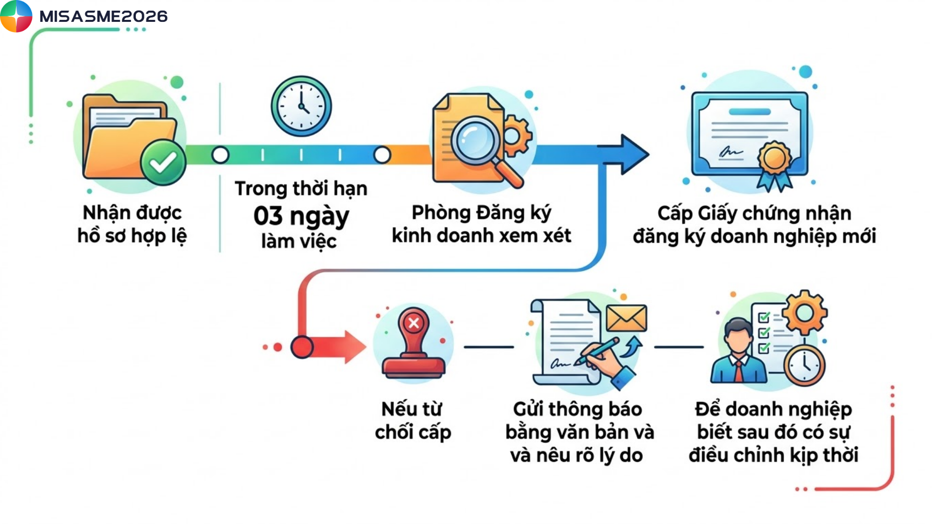 Trong thời hạn 03 ngày làm việc kể từ ngày nhận được hồ sơ hợp lệ, Phòng Đăng ký kinh doanh có trách nhiệm xem xét và cấp Giấy chứng nhận đăng ký doanh nghiệp mới. Nếu từ chối cấp, cơ quan đăng ký sẽ gửi thông báo bằng văn bản và nếu rõ lý do để doanh nghiệp biết sau đó có sự điều chỉnh kịp thời.