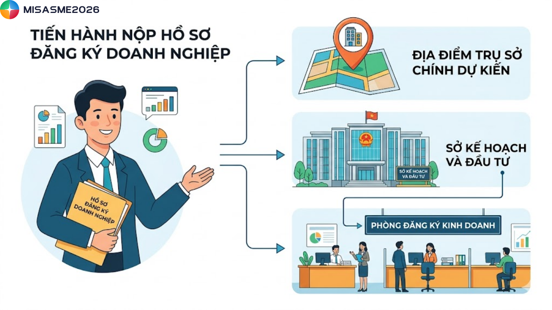 Tiến hành nộp hồ sơ đăng ký doanh nghiệp tại Phòng đăng ký kinh doanh (Thuộc Sở kế hoạch và Đầu tư) nơi công ty mới dự kiến đặt trụ sở chính.