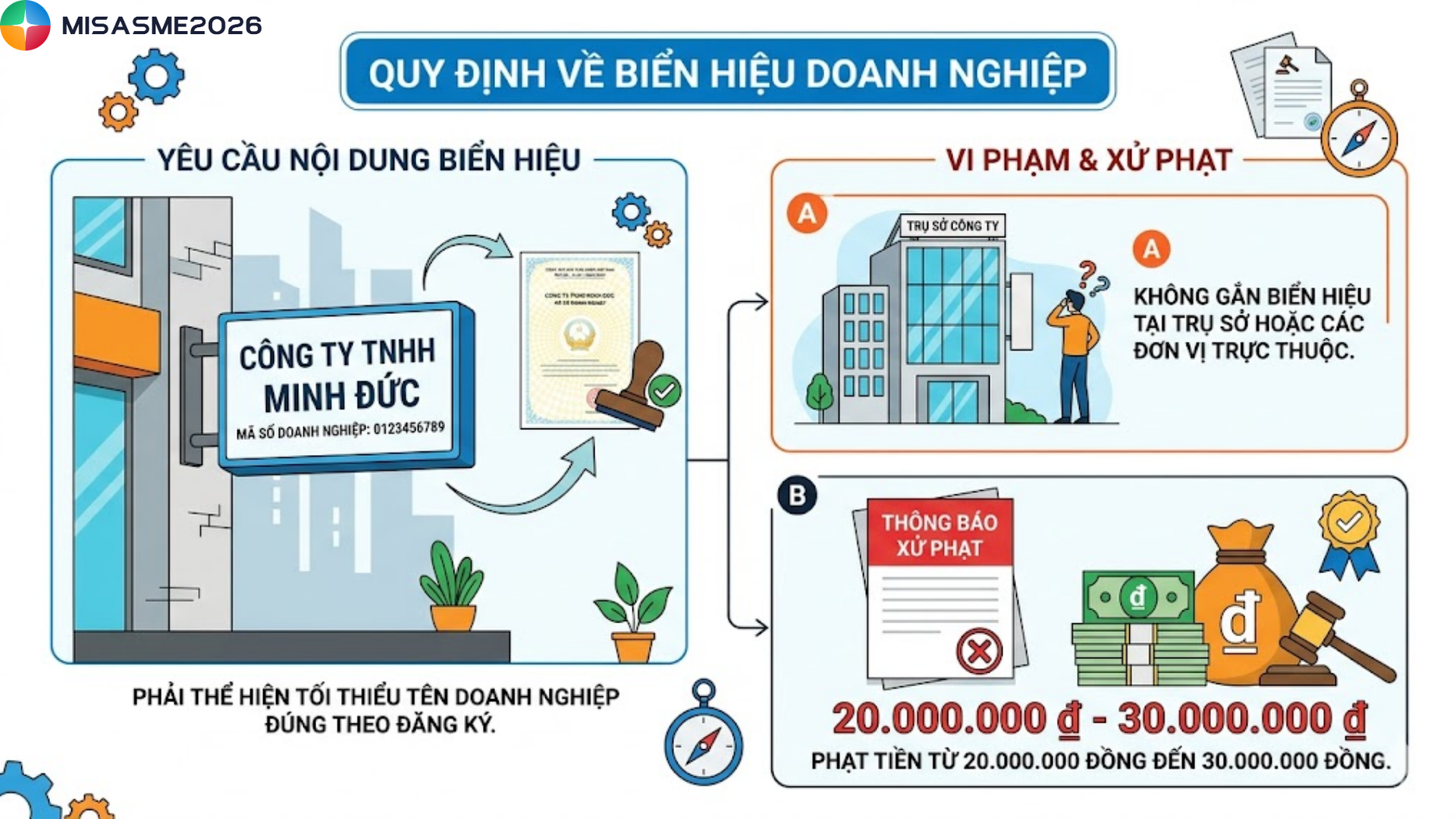 Nội dung biển hiệu cần thể hiện tối thiểu tên doanh nghiệp đúng theo đăng ký. Nếu không thực hiện gắn biển hiệu tại trụ sở hoặc các đơn vị trực thuộc, doanh nghiệp có thể sẽ bị phạt từ 20.000.000 đồng đến 30.000.000 đồng.