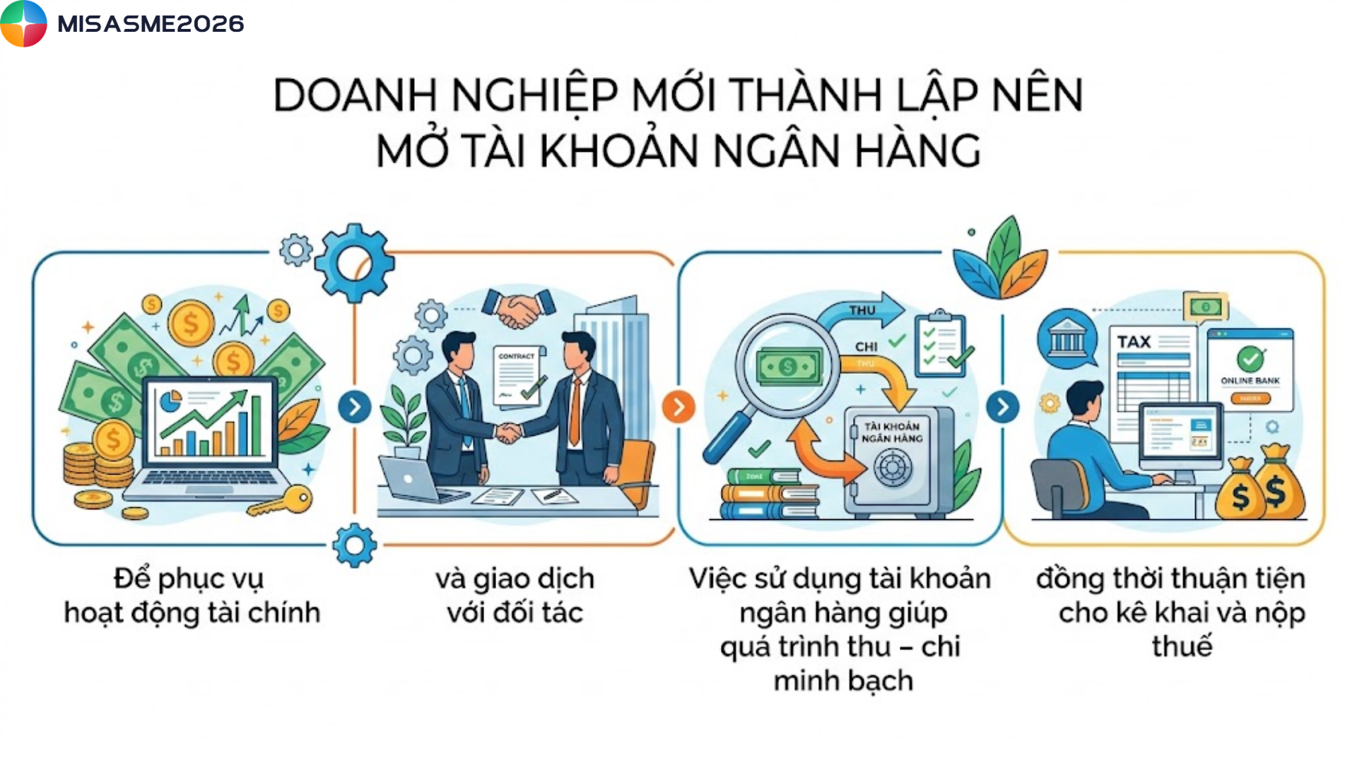 Ngoài ra, theo quy định về thuế, nhiều khoản chi chỉ được chấp nhận khi có chứng từ thanh toán không dùng tiền mặt. Vì vậy, việc mở tài khoản ngân hàng không chỉ phục vụ vận hành mà còn là điều kiện quan trọng để chi phí được hợp lệ khi quyết toán thuế.