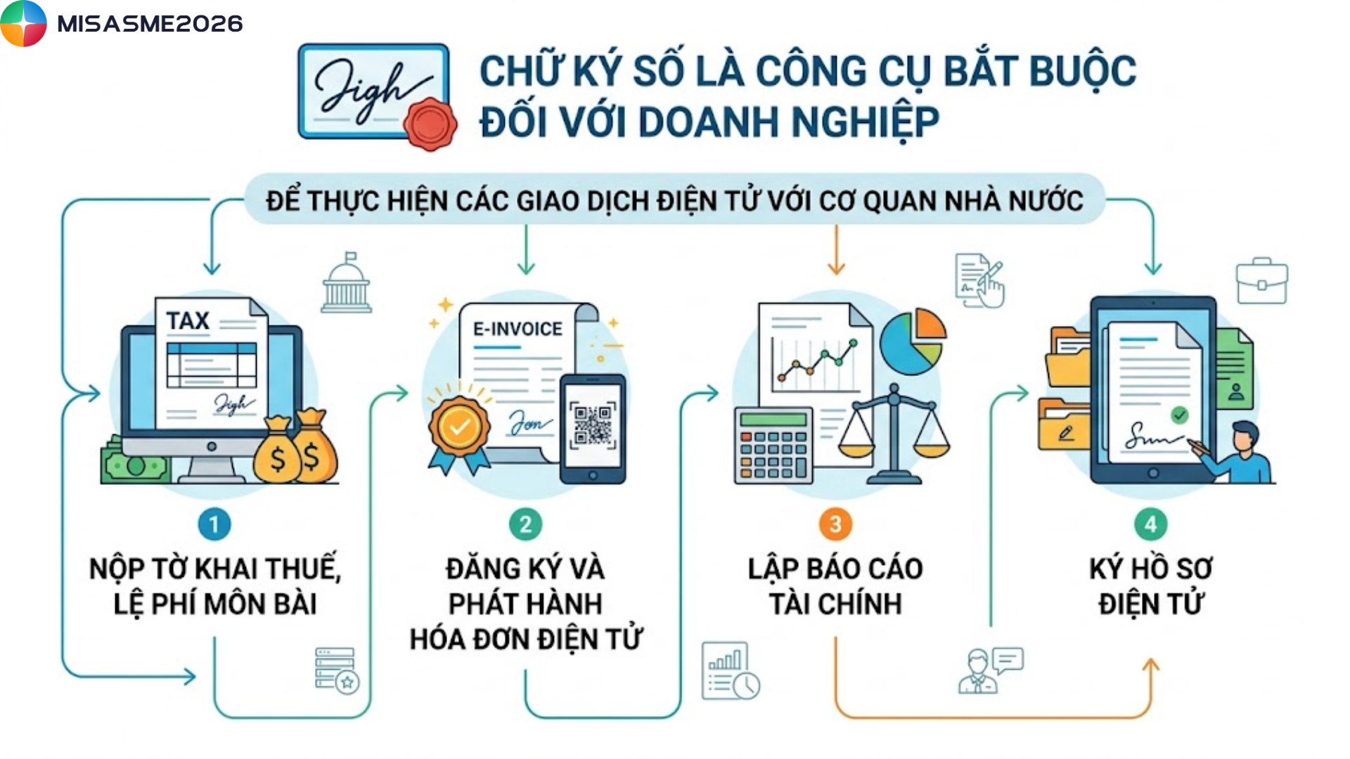 Chữ ký số là công cụ bắt buộc đối với doanh nghiệp để thực hiện các giao dịch điện tử với cơ quan nhà nước. Doanh nghiệp sẽ sử dụng chữ ký số trong các nghiệp vụ như nộp tờ khai thuế, nộp lệ phí môn bài, đăng ký và phát hành hóa đơn điện tử, lập báo cáo tài chính hoặc ký hồ sơ điện tử.
