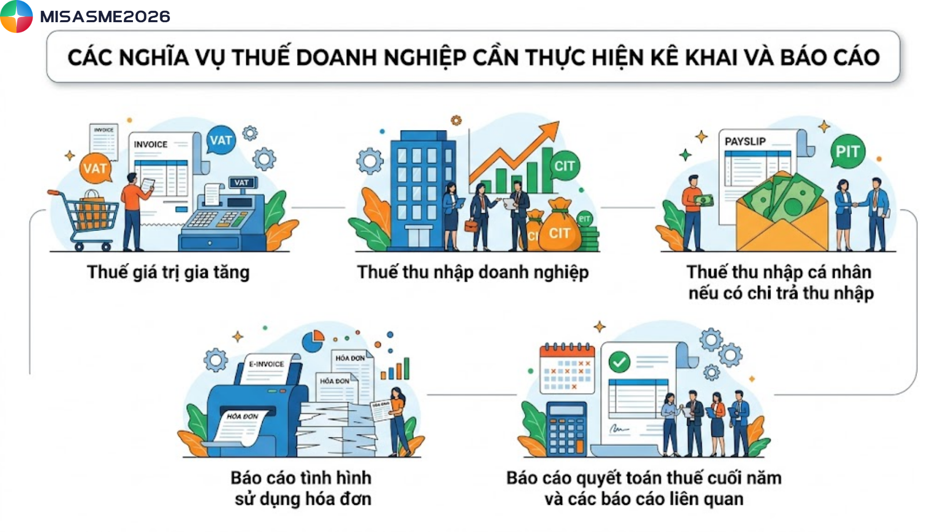 Các nghĩa vụ thuế doanh nghiệp cần thực hiện kê khai và báo cáo gồm: