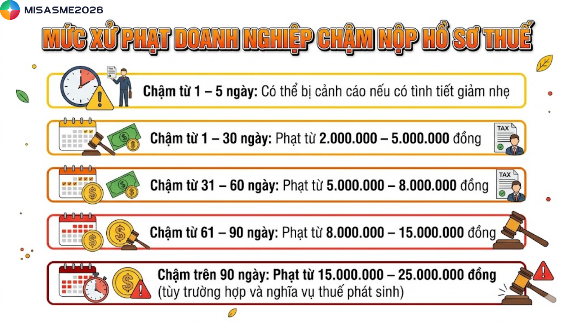 Lưu ý, doanh nghiệp cần theo dõi sát sao các mốc thời gian kê khai và nộp thuế. Nếu chậm trễ trong việc nộp hồ sơ kê khai, doanh nghiệp sẽ bị xử phạt. Mức phạt sẽ tùy thuộc vào số ngày chậm. Cụ thể như sau: