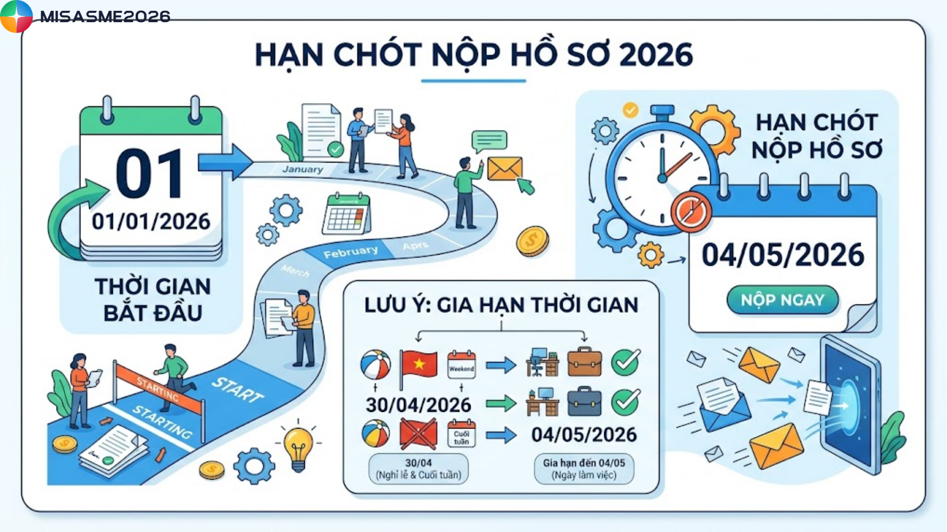 • Hạn chót nộp hồ sơ: Ngày 04/05/2026 (Mốc 30/04 trùng với ngày nghỉ lễ và cuối tuần nên thời gian được gian hạn sang ngày làm việc tiếp theo)