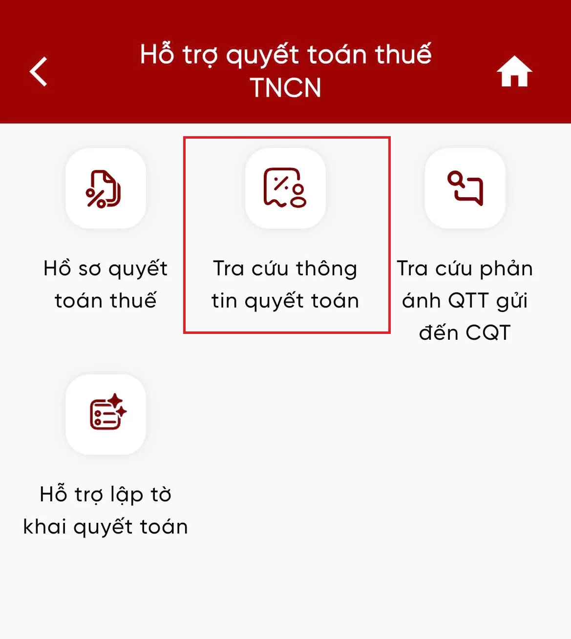 Đăng nhập vào ứng dụng eTax Mobile sau đó vào mục Tra cứu thông tin quyết toán hoặc Hỗ trợ quyết toán thuế TNCN
