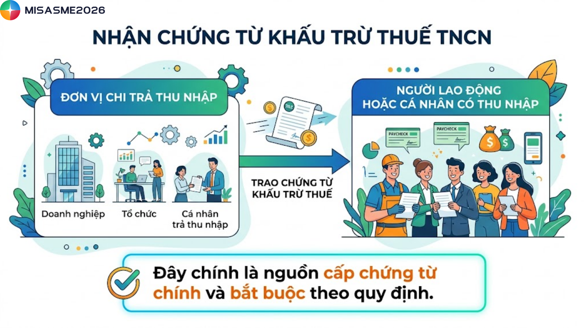 Người lao động hoặc cá nhân có thu nhập sẽ nhận chứng từ khấu trừ thuế trực tiếp từ đơn vị chi trả thu nhập (doanh nghiệp, tổ chức hoặc cá nhân trả thu nhập). Đây chính là nguồn cấp chứng từ chính và bắt buộc theo quy định.