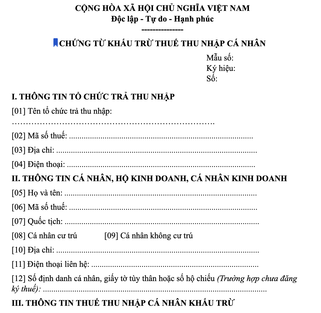 Mẫu chứng từ khấu trừ thuế thu nhập cá nhân mới nhất hiện nay là Mẫu số 03/TNCN, được ban hành kèm theo Nghị định 70/2025/NĐ-CP và chính thức có hiệu lực từ ngày 01/6/2025. Đây là mẫu chứng từ áp dụng thống nhất cho các tổ chức, cá nhân thực hiện khấu trừ thuế TNCN khi chi trả thu nhập.