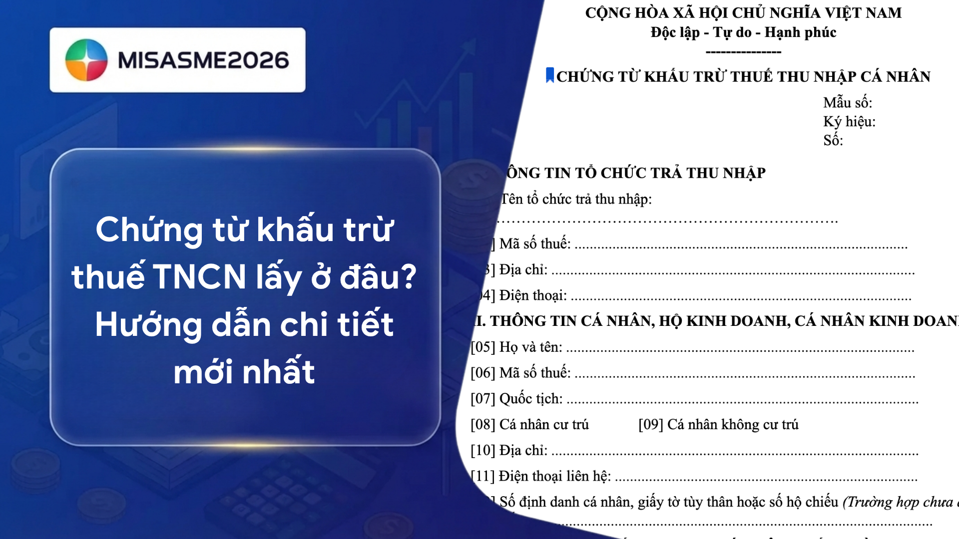 Bạn đang băn khoăn chứng từ khấu trừ thuế TNCN lấy ở đâu và cần chuẩn bị những gì để quyết toán thuế đúng quy định? Đây là một trong những giấy tờ quan trọng nhưng lại thường bị bỏ sót hoặc hiểu sai trong quá trình kê khai thuế. Nếu bạn chưa rõ cách xin, nơi cấp hay nội dung cần kiểm tra trên chứng từ, hãy theo dõi bài viết dưới đây của phần mềm kế toán MISA SME để được hướng dẫn chi tiết và tránh các rủi ro không đáng có khi quyết toán thuế.