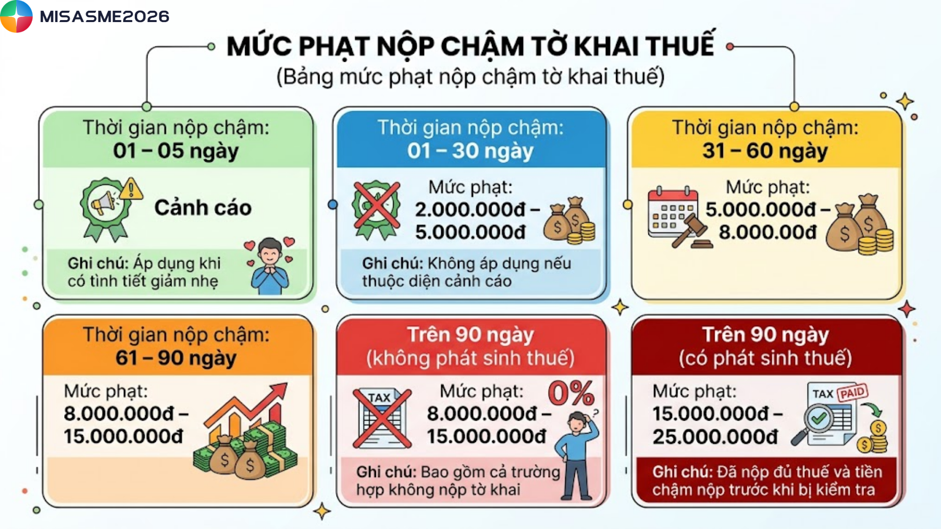 | Trên 90 ngày (có phát sinh thuế) | 15.000.000đ – 25.000.000đ | Đã nộp đủ thuế và tiền chậm nộp trước khi bị kiểm tra |
