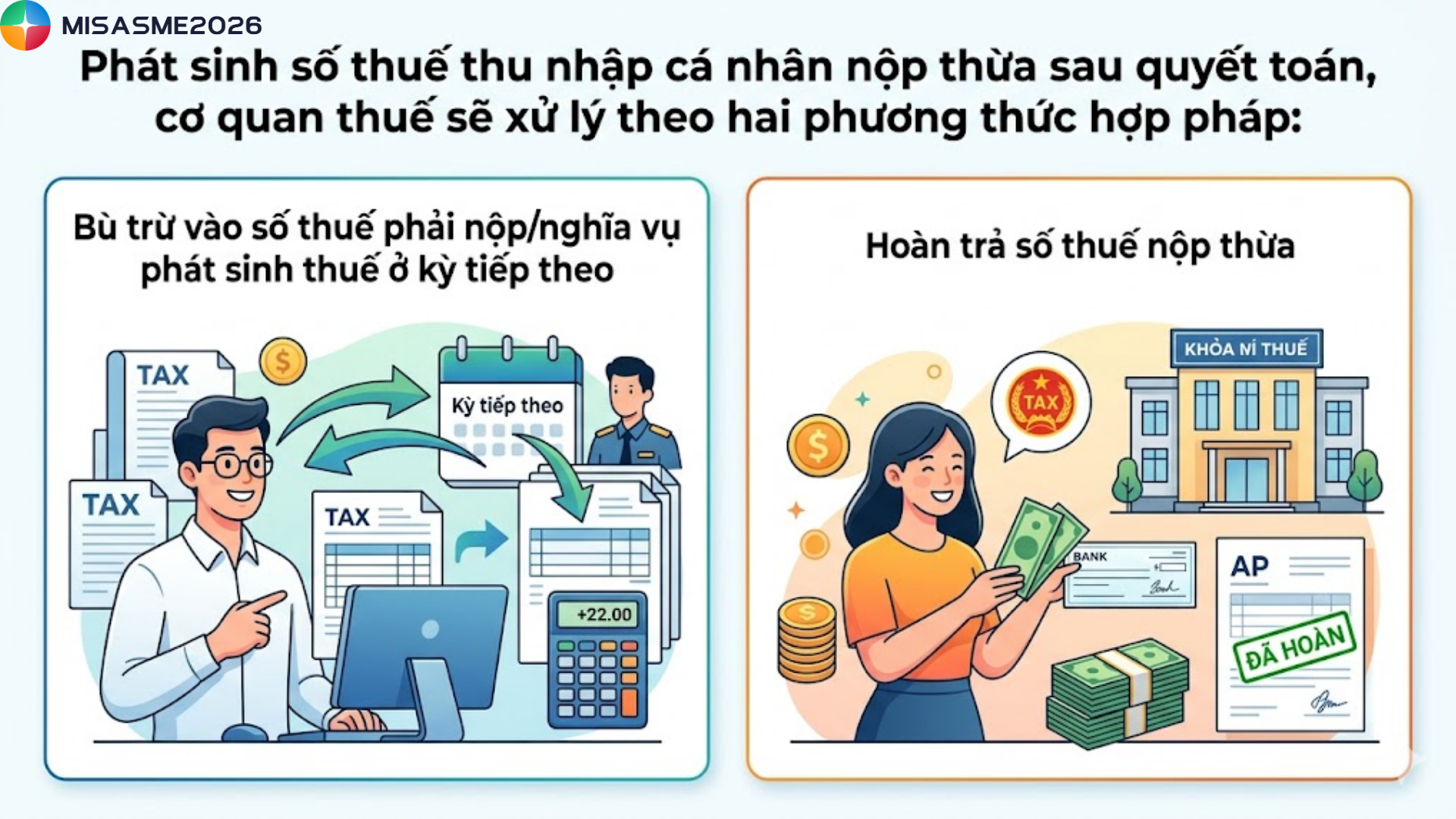 Bạn đang thắc mắc thuế TNCN nộp thừa có được chuyển sang năm sau hay không và nên xử lý như thế nào để không mất quyền lợi? Đây là vấn đề rất nhiều cá nhân và doanh nghiệp gặp phải sau khi quyết toán thuế nhưng lại dễ hiểu sai quy định. Nếu bạn chưa rõ nên hoàn thuế hay bù trừ ra sao, hãy tìm hiểu ngay để tránh sai sót và tối ưu số tiền đã nộp. Bài viết dưới đây của phần mềm kế toán MISA SME sẽ giúp bạn nắm rõ quy định mới nhất cũng như cách xử lý thuế TNCN nộp thừa một cách chính xác và hiệu quả.