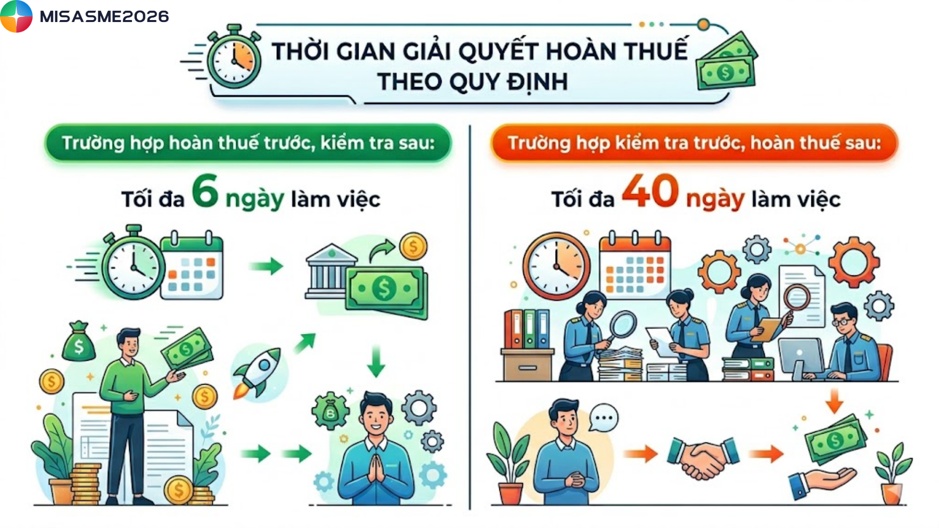- Trường hợp kiểm tra trước, hoàn thuế sau: Tối đa 40 ngày làm việc