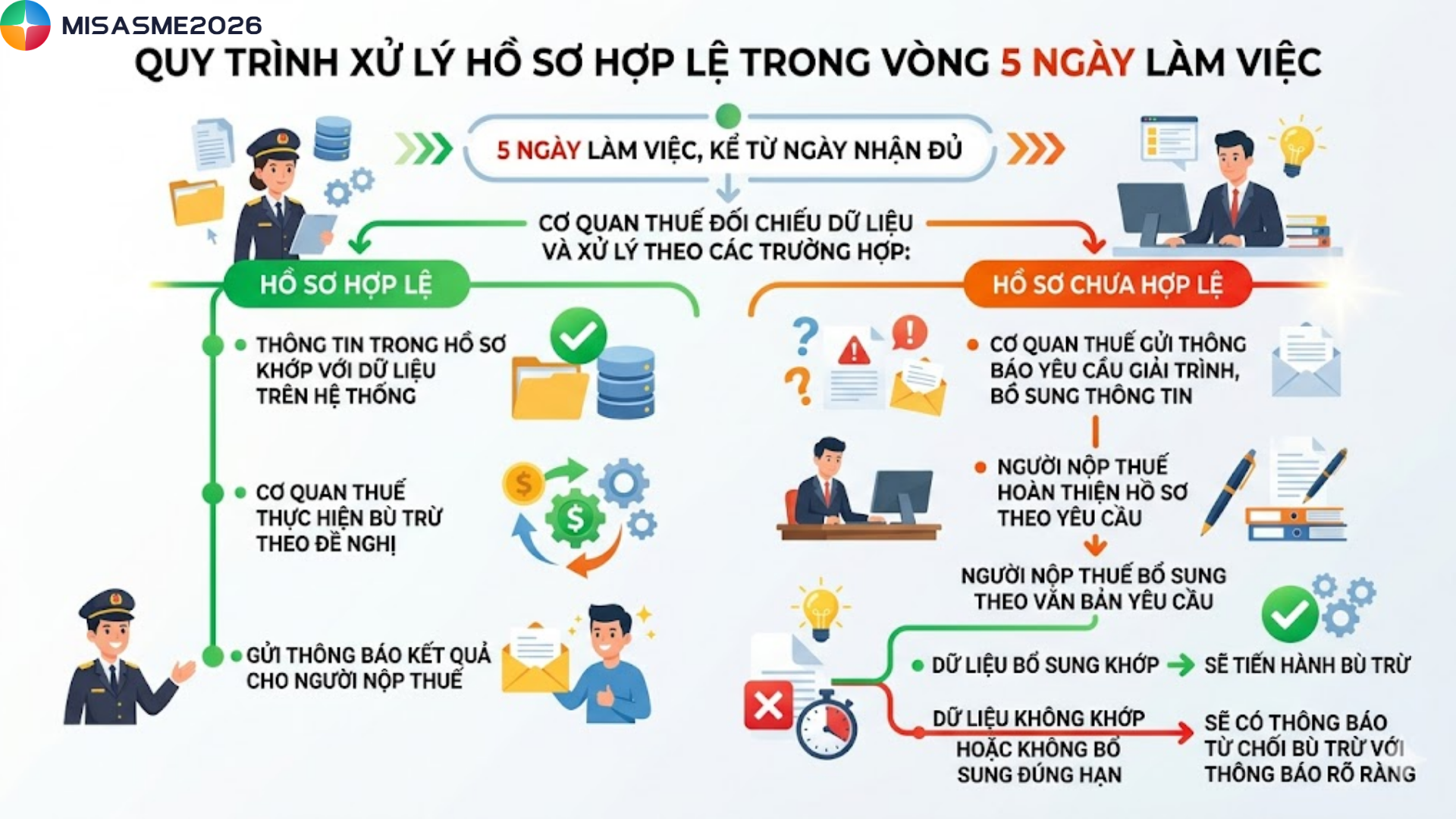 Thời gian xử lý hồ sơ hợp lệ trong vòng 5 ngày làm việc, kể từ ngày nhận đủ. Cơ quan thuế sẽ thực hiện đối chiếu dữ liệu và xử lý theo các trường hợp: