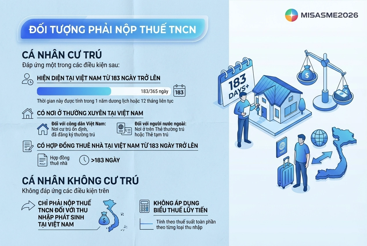 Lưu ý: Nếu cá nhân có nơi ở thường xuyên tại Việt Nam nhưng thời gian thực tế có mặt dưới 183 ngày trong năm, thì vẫn được xác định là cá nhân cư trú nếu không chứng minh được là đối tượng cư trú tại quốc gia khác. Việc chứng minh phải có Giấy chứng nhận cư trú do nước ngoài cấp hoặc tài liệu hợp lệ theo quy định của hiệp định thuế.